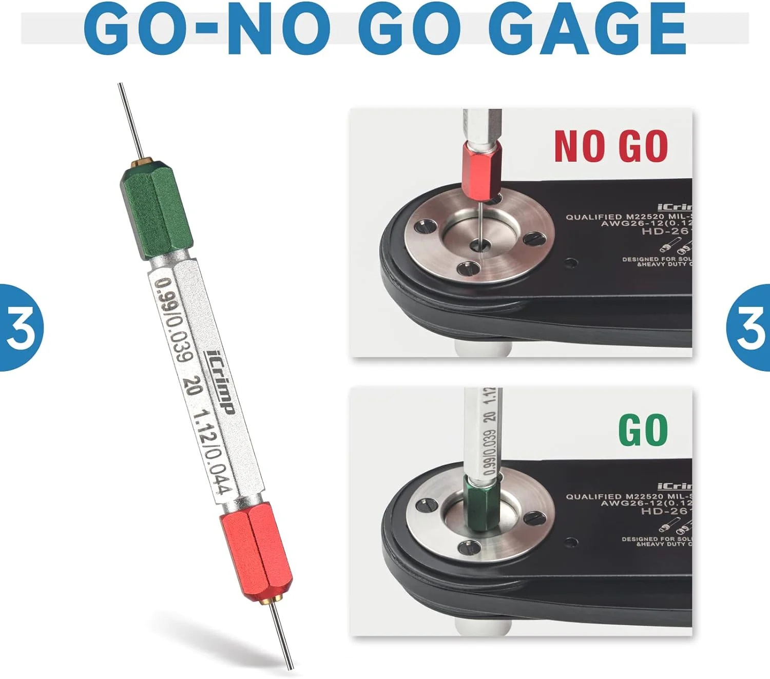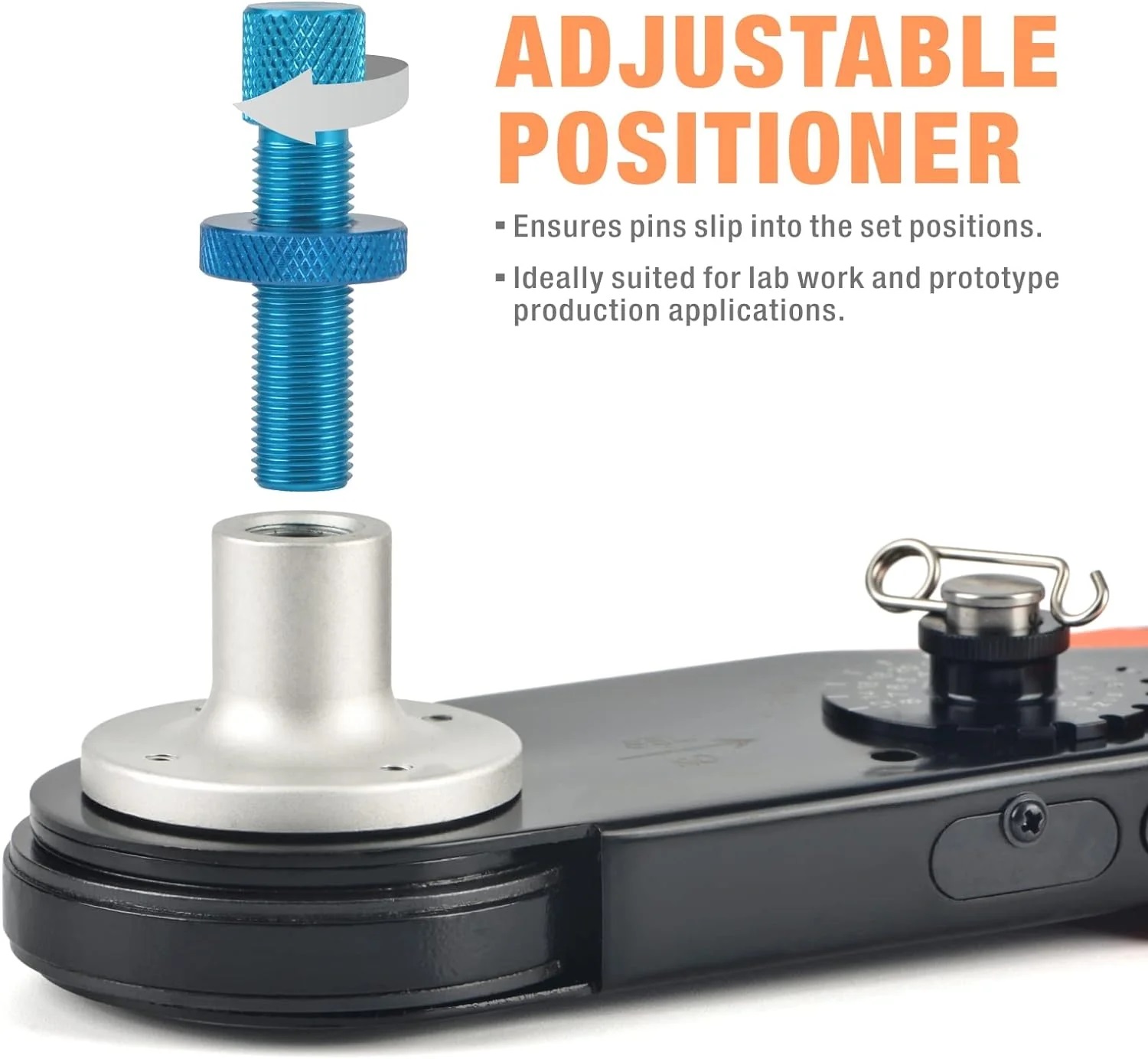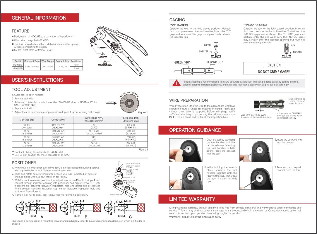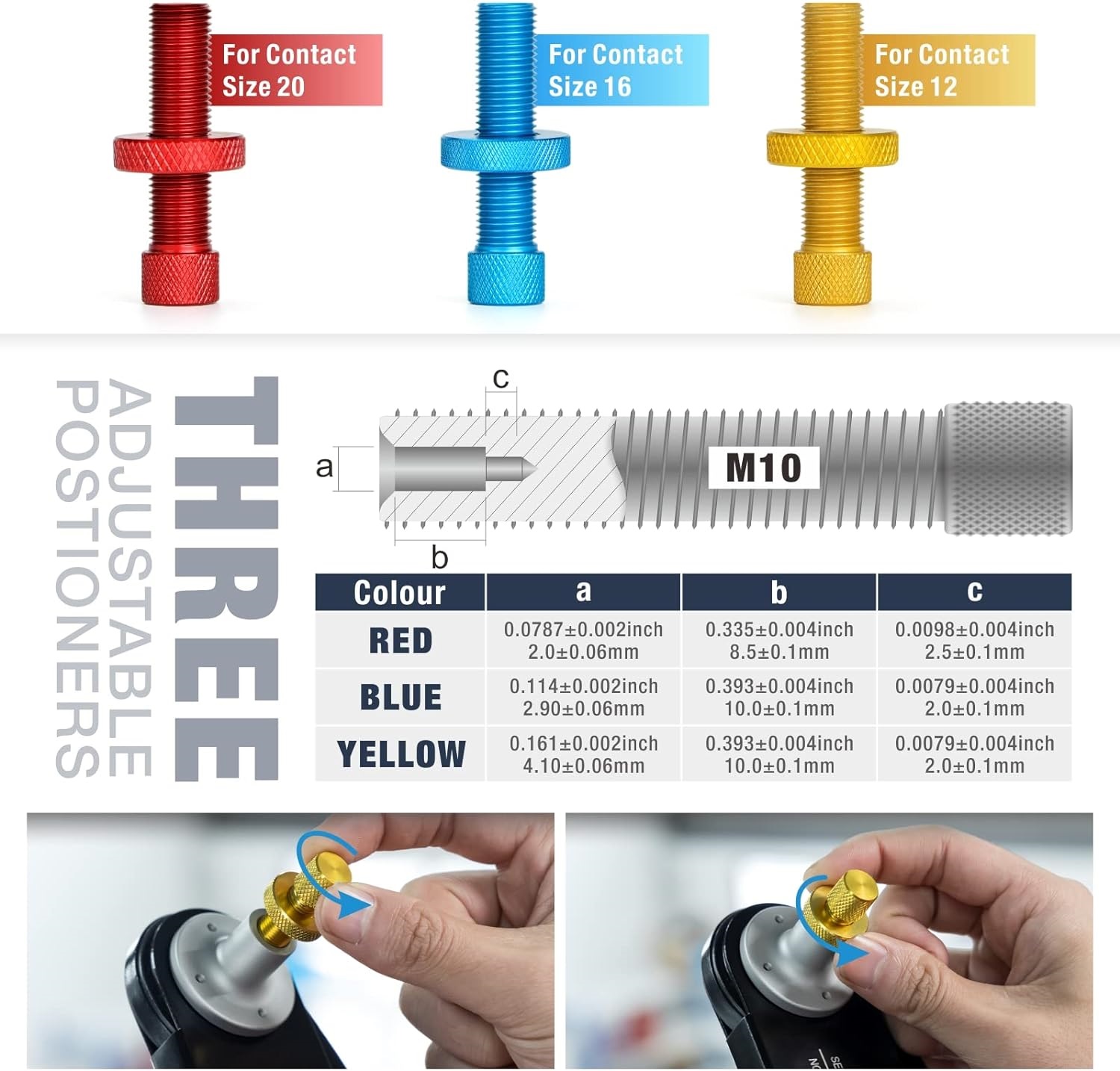 • ช่วงการจีบหลายแบบ: ใช้ได้กับทั้งหน้าสัมผัสแบบพินและซ็อกเก็ต เครื่องมือการจีบมีคุณลักษณะการปรับสกรูแบบง่ายสำหรับความสูง/ขนาดหน้าสัมผัส และหน้าปัดสำหรับเลือกขนาดสายที่ใช้ได้