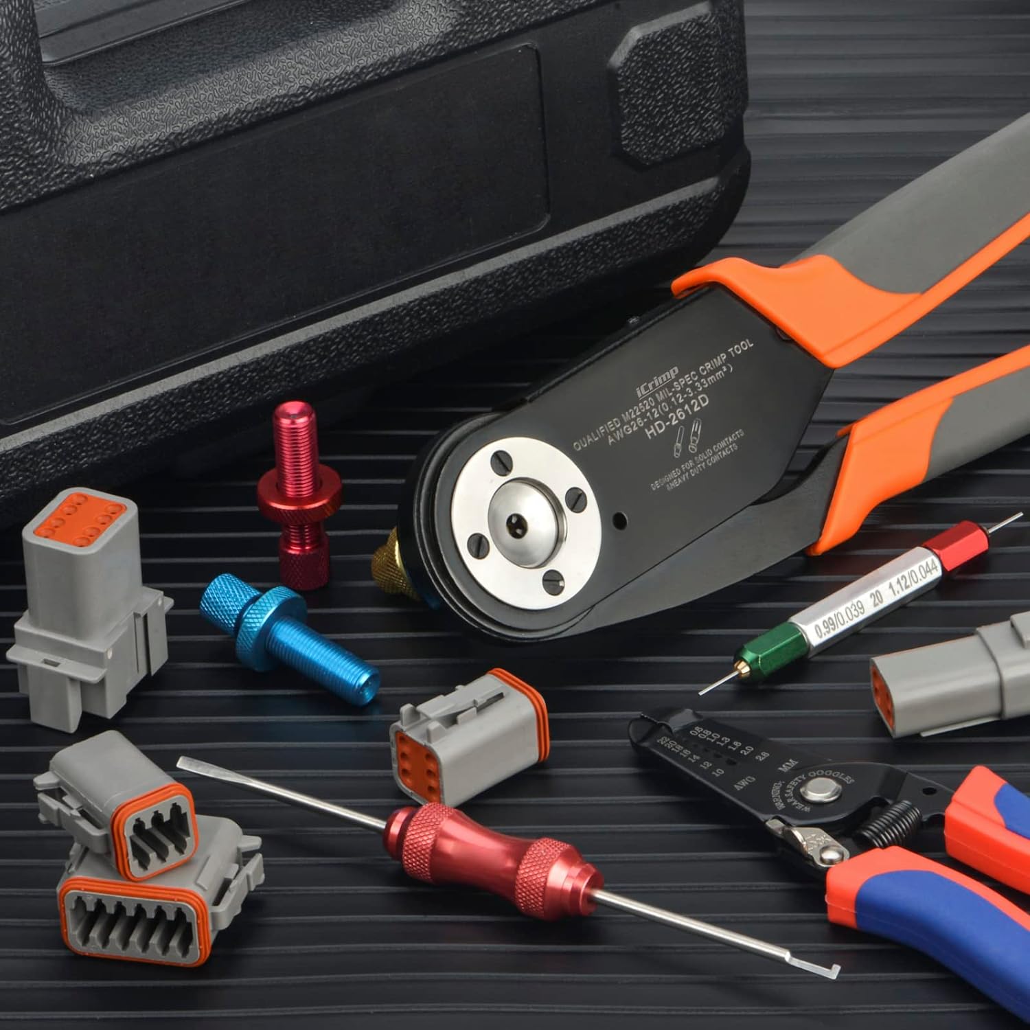 • วัตถุประสงค์: เครื่องมือจีบสาย HD-2612D ของ Deutsch ออกแบบมาเพื่อจีบสายสัมผัสของ Deutsch ให้เข้ากับสายไฟที่เหมาะสมสำหรับการใส่เข้าในขั้วต่อไฟฟ้าของยานยนต์ของ Deutsch มีตัวกำหนดตำแหน่งคงที่เพื่อการจีบสายอย่างรวดเร็ว