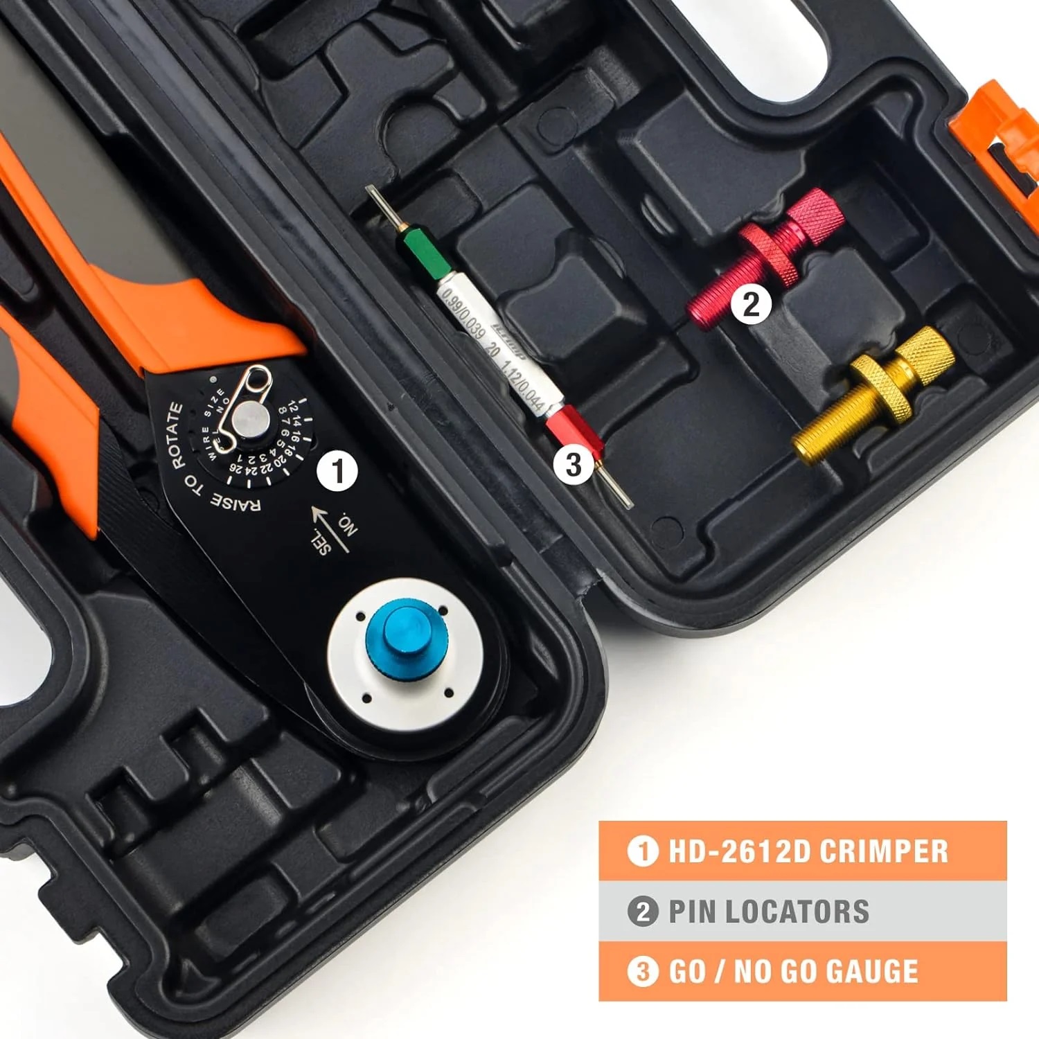• ความสามารถ: HD-2612D สามารถจีบคอนแทคแบบแข็งขนาด 26 ถึง 12 AWG ได้ ช่วงการจีบนี้ทำให้เป็นเครื่องมือจีบอเนกประสงค์ของ Deutsch สำหรับขั้วต่อ Deutsch รวมถึงซีรีส์ DT (ขนาด 16 คอนแทค, 14-20AWG), ซีรีส์ DTM (ขนาด 20 คอนแทค, 16-22AWG), ซีรีส์ DTP (ขนาด 12, 10-14AWG) รวมถึงซีรีส์ HD30, HDP20, DRC, HD10, DRB, STRIKE และ Jiffy Splice